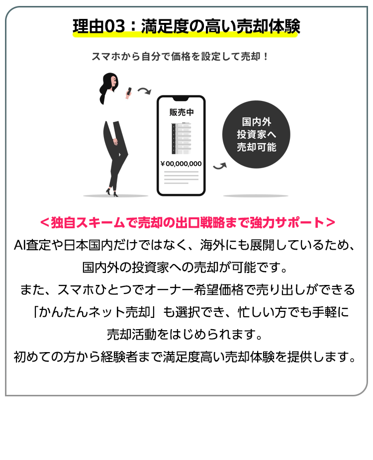 国内の優良物件のみならず、海外物件も含めて幅広く提案してもらえるのが特徴です。